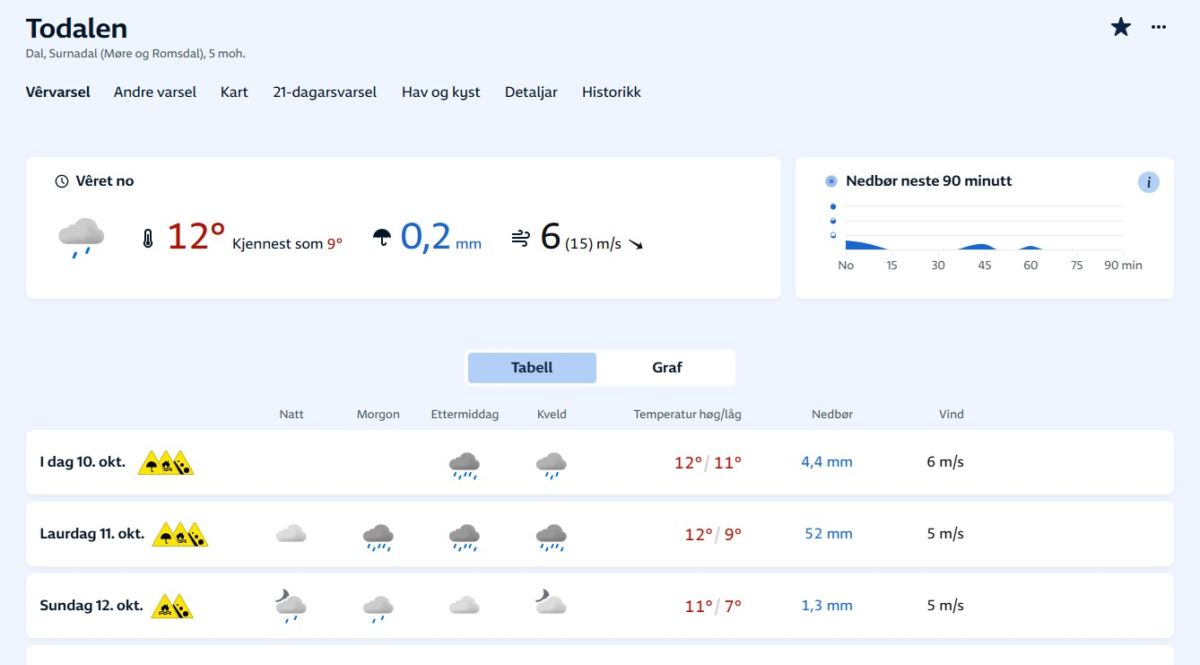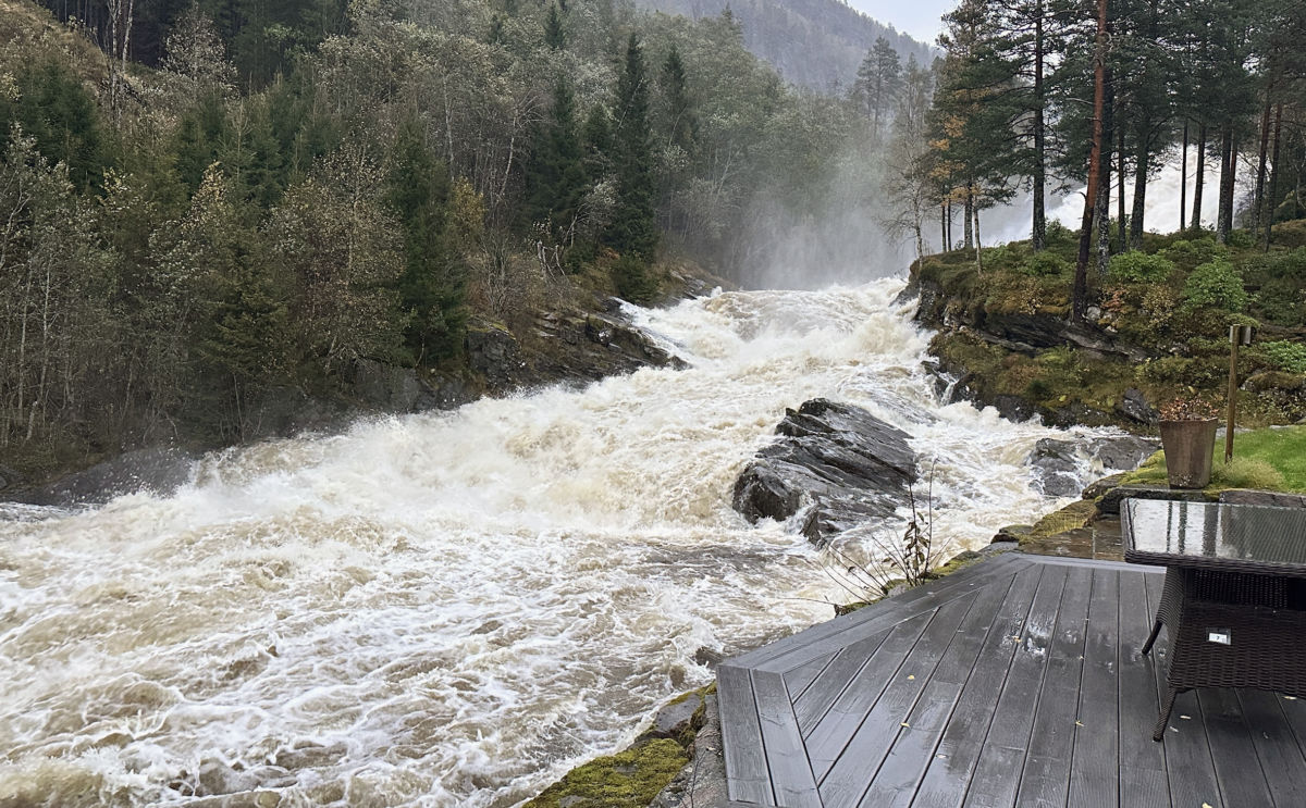 Etter kvart har vi vel vorte vant med farevarsel, og denne helga er det gult varsel for både mykje regn, flaumfare, jord- og flomskredfare og kartige vindkast. Utover ettermiddagen i dag har det regna jamt, og etter kvart har det og auka på med veståver. Det har etter kvart ført til stor vassføring i heile todalsvassdrage.