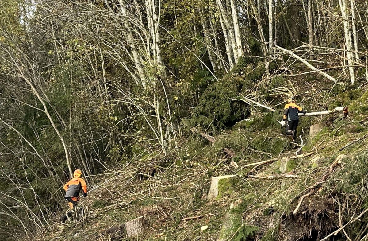 Svorka ordnar seg på å reparere skaen på høgspentlinja inn til Todalen – to kablar på linja vart kutta i samband med trefall under stormen Amy for eit par veker sia. I mellomtida går straumforsyninga via høgspentkablar frå Drivhammaren og innover til kraftstasjonen i Rossåa. Pål Heggset og John Langli er i gang med linjeryddinga og klargjer området til reparasjonsarbeidet startar.