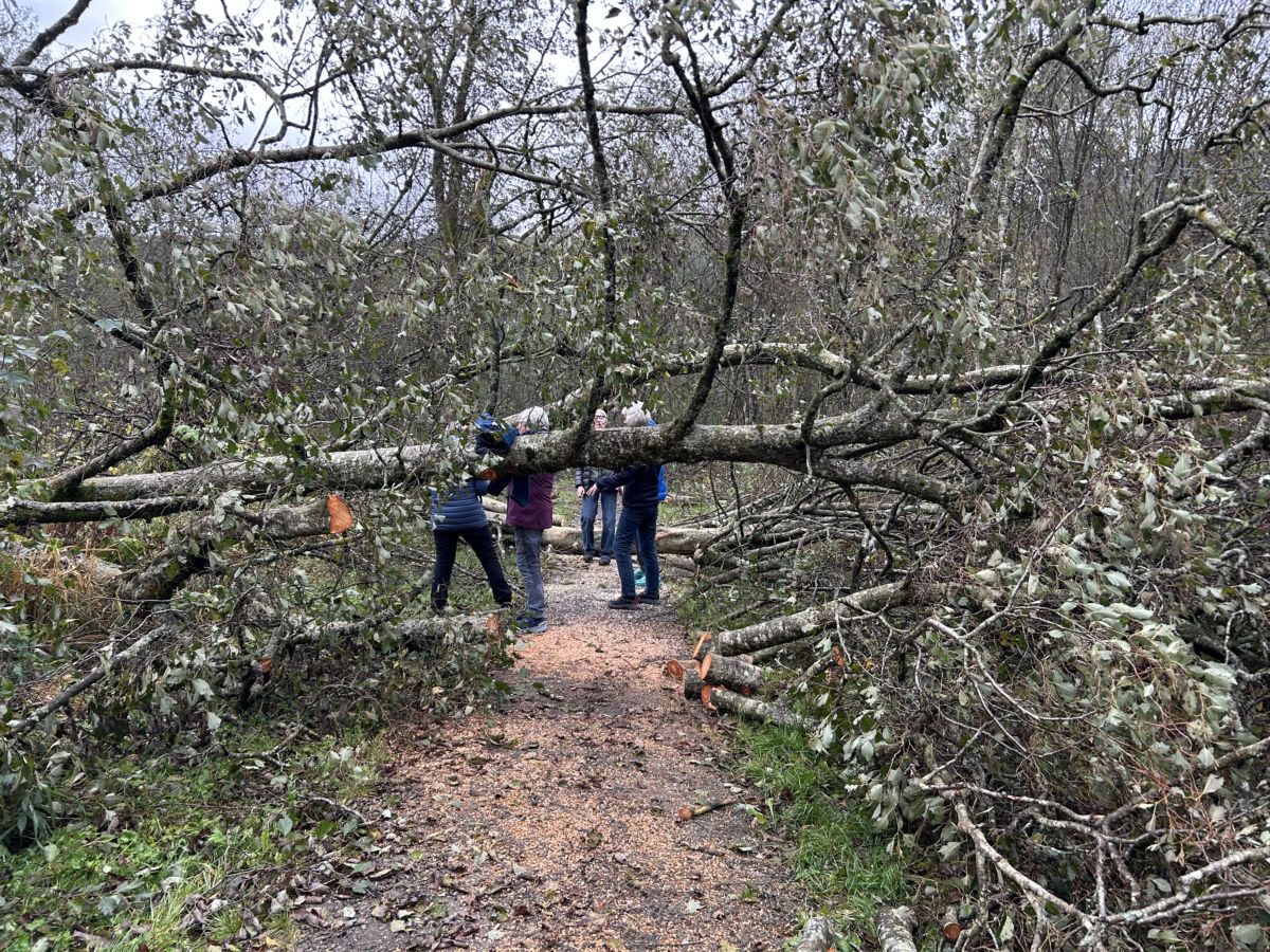 Stort arbeide å rydde opp att etter uveret. Kløverturgjengen på inspeksjon. Foto: Marit Sanden Søyset.