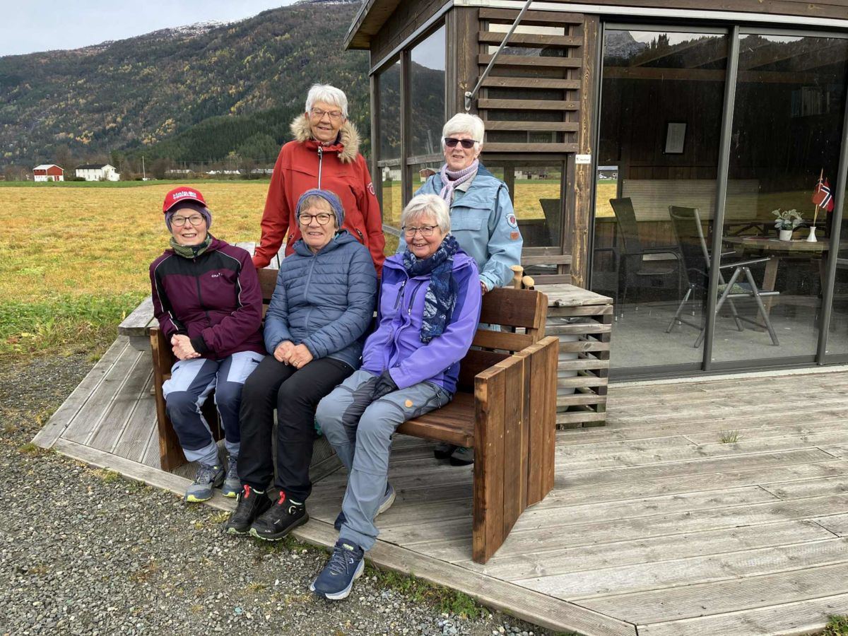 Ny og god benk ved gapahuken i Båthølen. Dordi Jorunn, Jorunn og Helen prøvesit nybenken. Attanfor: Arndis og Dordi. Foto: Marit Sanden Søyset.