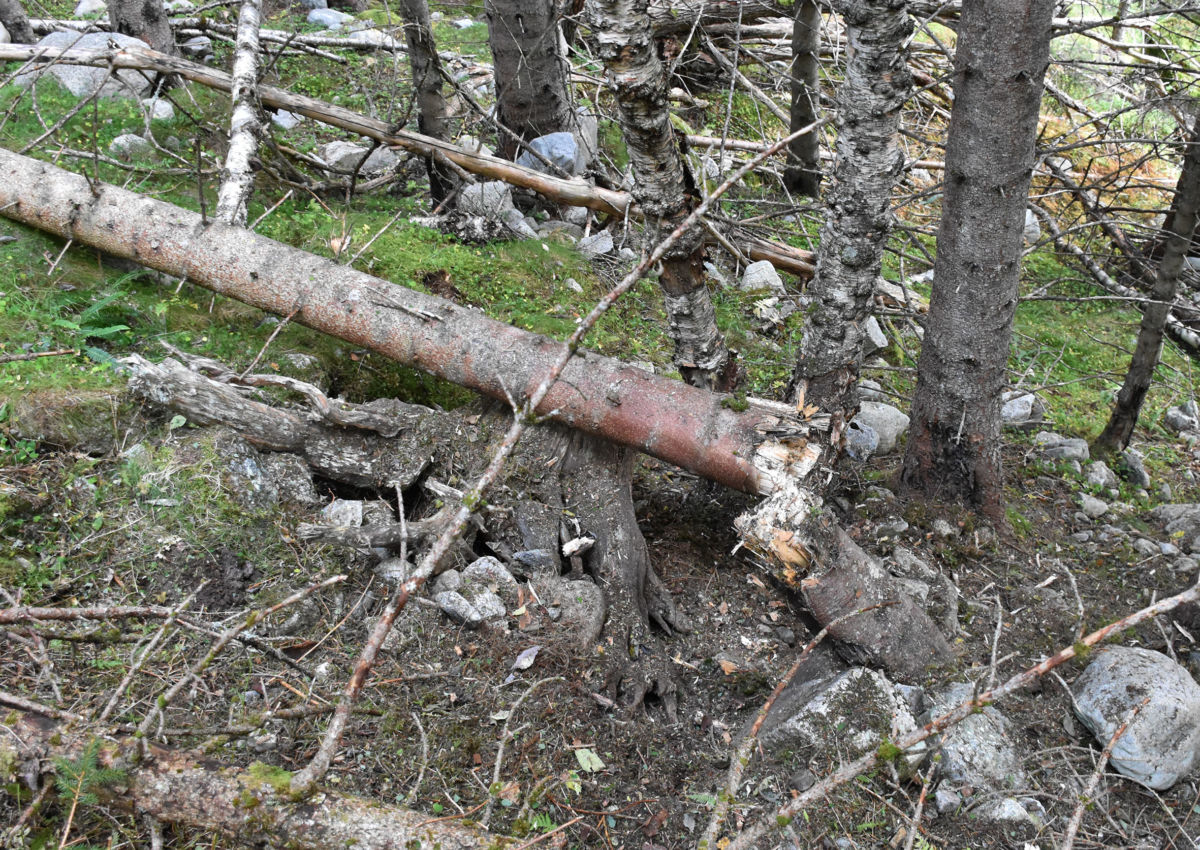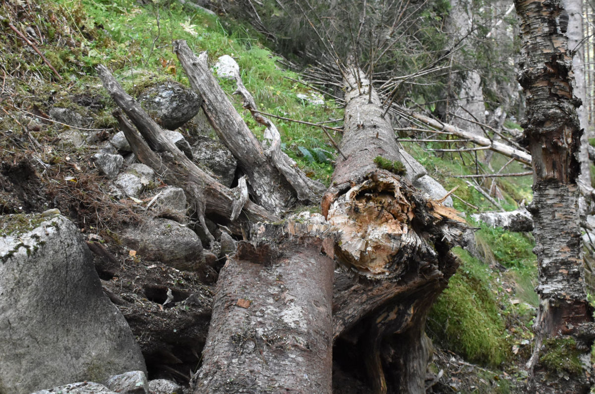 Resultatet av sprengninga – sprengladninga hadde ingen problem med rotstokken på denne grana. Foto Torgeir Stenberg, S-nett