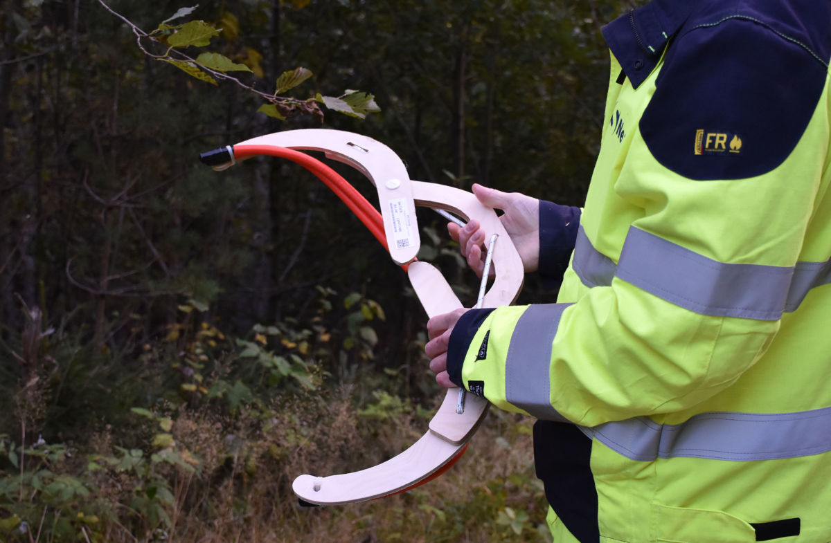 Klave med sprengstoff som du låser rundt treet som skal sprengast. Derme konsentrerer du sprengkrafta inn mot treet. Foto Jon Olav Ørsal