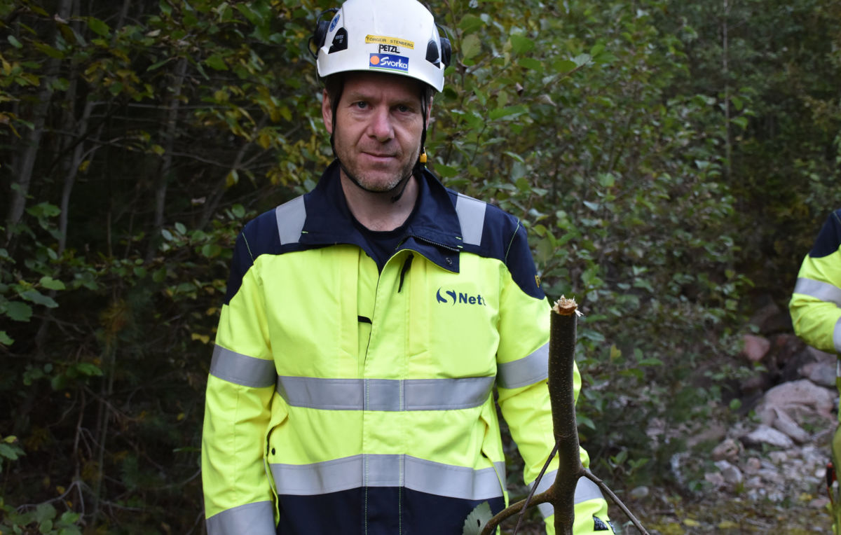 I dag var det altså berre ei øving, og det er nok uvanleg at vêrgudane er i så godt lynne når slikt arbeid foregår. Som oftast er det mykje både vêr og vind når ein har behov for å fjerne tre frå linja. I dag var det berre øving, og det skjedde straks nedafor beråbakkbrua på vegen opp mot inntaket for Råssåfoss kraftverk. Heilse gjengen på S-Nett deltok på øvinga for å samle litt kompetanse til det blir bruk for dette i arbeidet.