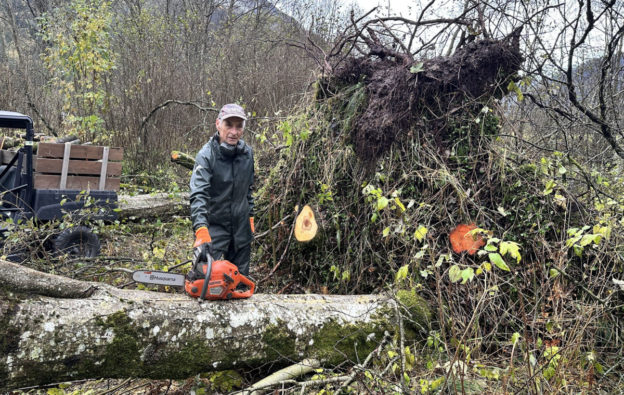 Hauststormen Amy laga litt av eit kaos i Toåa tursti, der stien går gjennom Gunnøyskogen. Her var det mykje stor older som hadde gått overende og sperra for trafikk dei første dagane etter stormen. Men gudmund Kvendset bretta opp ermane og sette i gang med oppryddingsarbeidet med motorsag.