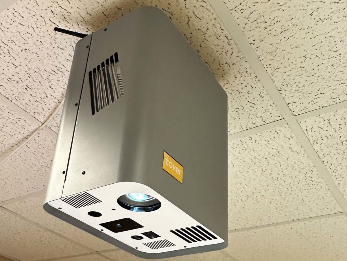 Slik ser boksen som er monterti taket over bordet – den lyser ned på bordet og blir påvirka av aktivitet på bordet. Foto Jon Olav Ørsal